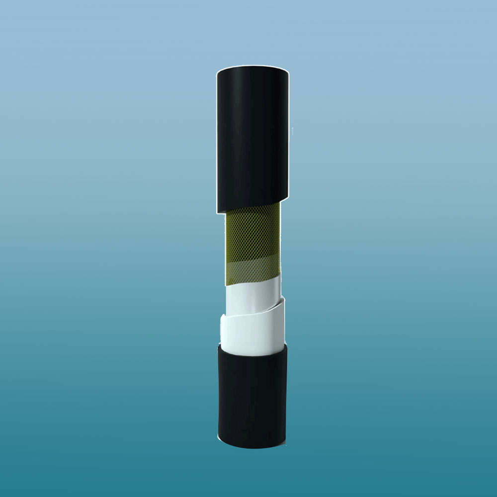 玄武巖纖維纏繞增強(qiáng)聚乙烯復(fù)合(CBF-PE)管 以聚乙烯為基體,以粘接樹(shù)脂包覆處理后的玄武巖纖維左右連續(xù)螺旋纏繞成型的網(wǎng)狀